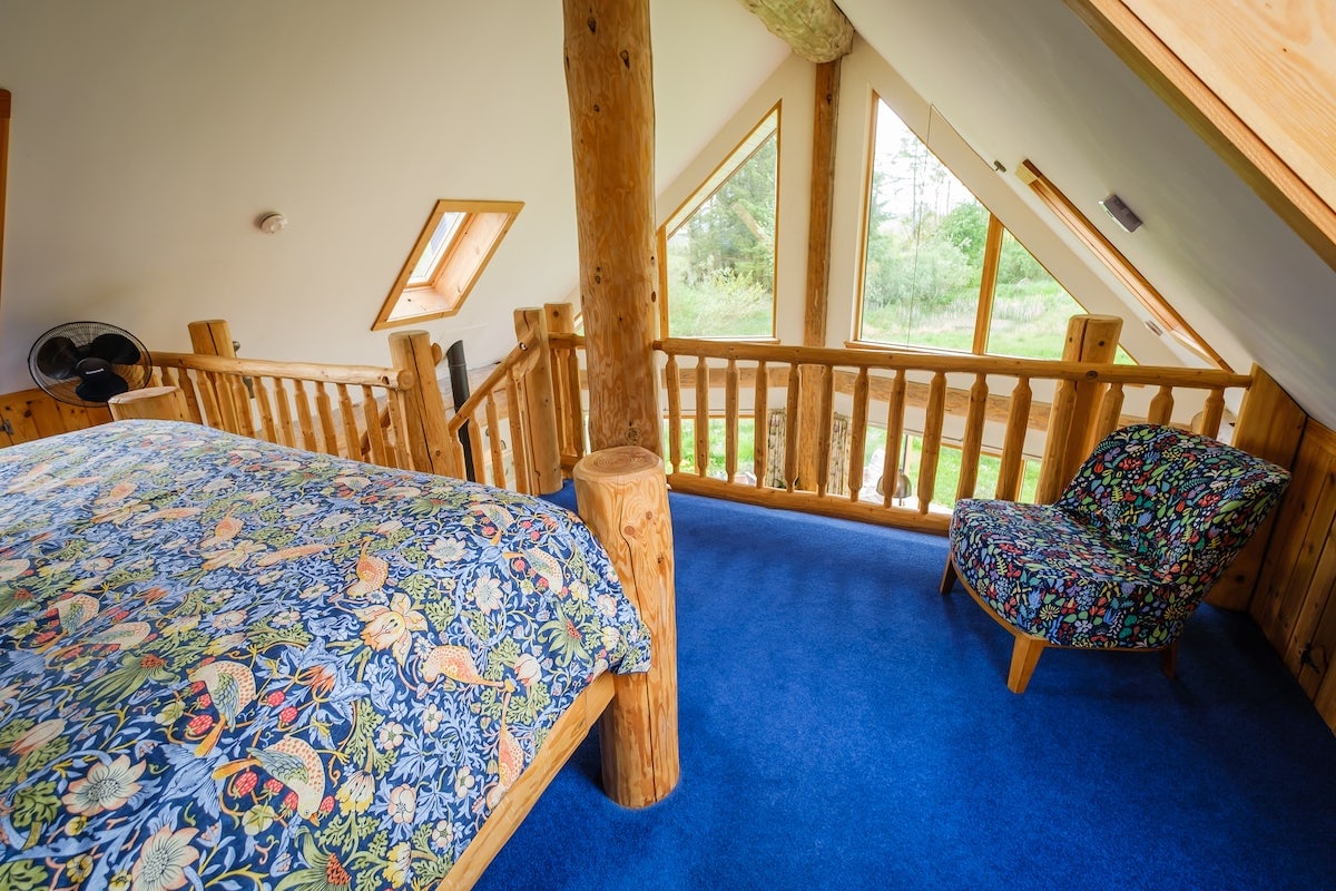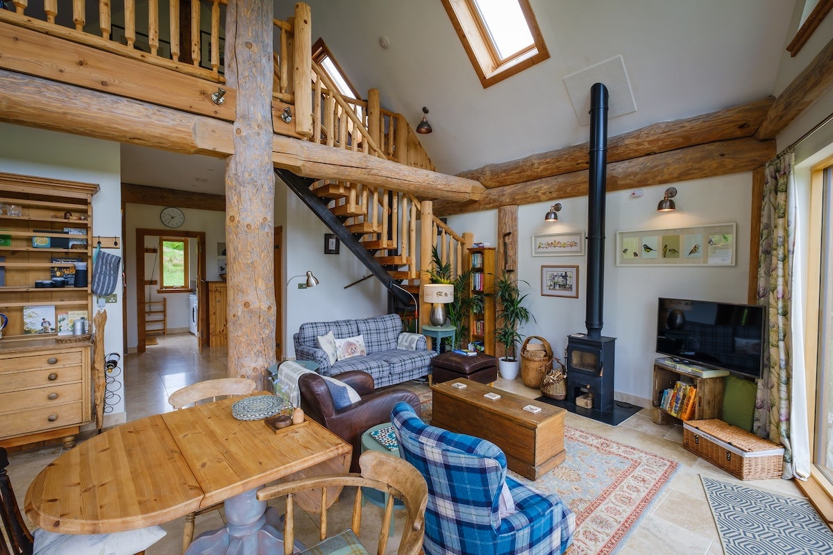 Constructed using locally sourced Douglas fir, the cottage is highly insulated, boasts a wood-burning stove, underfloor heating, and is powered by renewable energy with solar electricity and natural spring water.